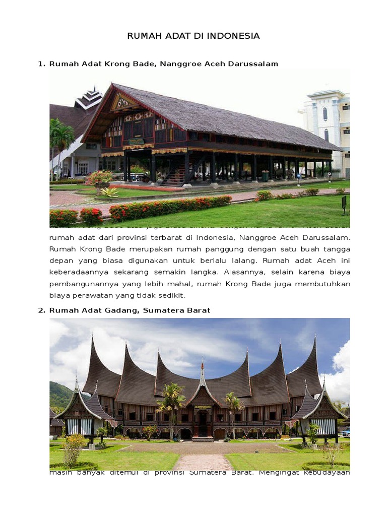 Rumah adat bolon dari Sumatera Utara. Rumah Krong Bade adalah rumah adat dari Nanggroe Aceh Darussalam. Rumah krong bade juga biasa dikenal dengan nama rumoh aceh.
